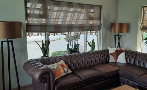 Hier werd mijn hulp ingeroepen bij het kiezen van gordijnstof bij deze paarsblauwe banken en een cyclaamroze stoel. Ook het kunstwerk vroeg om rekening mee gehouden te worden. Maar gordijnstof in dezelfde kleurstelling zou het geheel te bont maken en afleiden van de mooie kleurencombinatie die er al was. We kozen een subtiele lichte tint voor in de zithoek, en een bijpassend dieper paars voor gordijnen achterin de kamer, waardoor ook dat deel meer bij het geheel werd betrokken.
