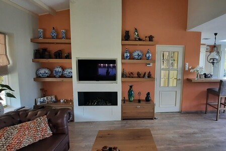 Deze TV met haard mocht de blikvanger van de woonkamer worden. We kozen neutrale tinten voor ombouw en wanden, passend bij de gordijnen en klassieke meubels. De nieuwe banken geven het geheel toch een eigentijdse uitstraling.