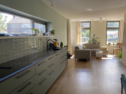 In de woonkamer achter deze keuken, was de wand door de vorige bewoners in een moderne grijstint geschilderd. Maar grijs pakt in het Nederlandse klimaat niet altijd fijn uit: de kamer werd er donker en somber van. Deze zonnige natureltint bracht een enorme metamorfose. Voor de lichte keuken kozen we een moderne paarsgrijze tint, die mooi contrasteert met de kleur erachter.