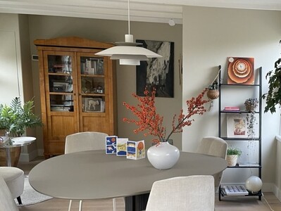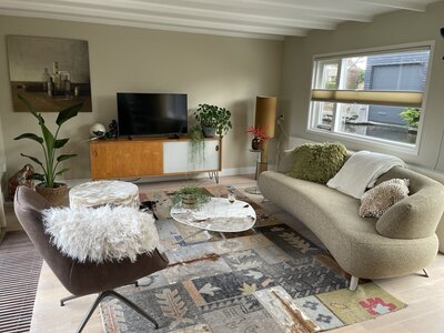 De bewoonster van dit huis miste evenwicht in de kleuren in haar woonkamer. Dus zochten we kleuren uit voor de nieuwe eetkamerstoelen en een bijpassende kleur voor een wandje tegenover de eettafel. Bovendien verhuisde het te blauwe vloerkleed naar de logeerkamer. Het resultaat was boven verwachting: de banken komen mooier uit en het geheel voelt prettiger aan.