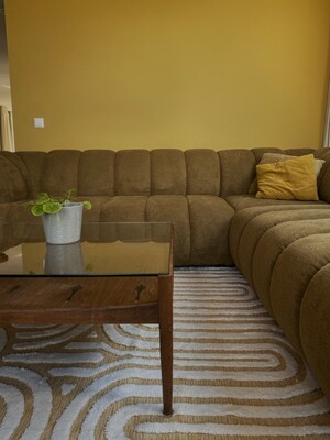 Deze woonkamer mocht frisser, lichter en warmer worden. Dit groenige geel, met er tegenover een natureltint, heeft de voorheen beige met terra kamer enorm opgeruimd.
